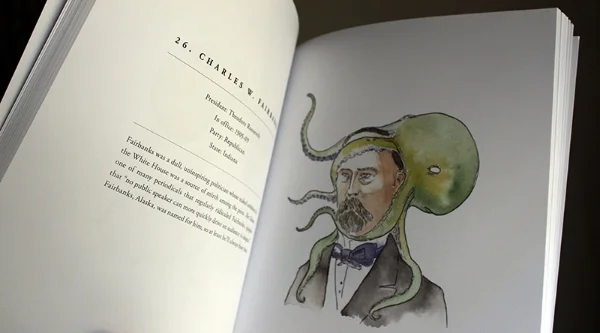 Anyone who's been reading this blog knows that I've been trying to get my Veeptopus series into book form for a while. While drawing these watercolor/ pen & ink cephalopod-bedecked portraits over and over and over again, I learned something about each and everyone of these vice presidents. Little stories that were not only weird and wonderful but also revealing about both the character of the man (and, to date, they are all men) and the time he lived. I wanted to share all that with you.