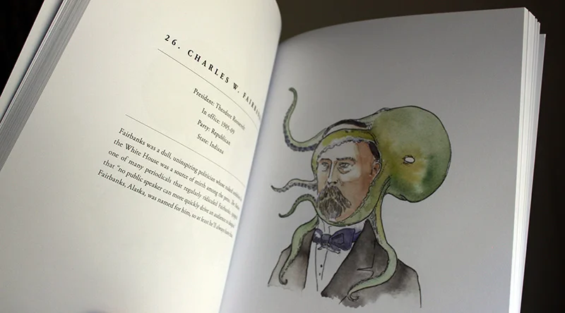 Anyone who's been following me knows that I've been trying to get my Veeptopus series into book form for a while. While drawing these watercolor/ pen & ink cephalopod-bedecked portraits over and over and over again, I learned something about each and every one of these vice presidents. Little stories that were not only weird and wonderful but also revealing about both the character of the man (and, to date, they are all men) and the time he lived. I wanted to share all that with you.