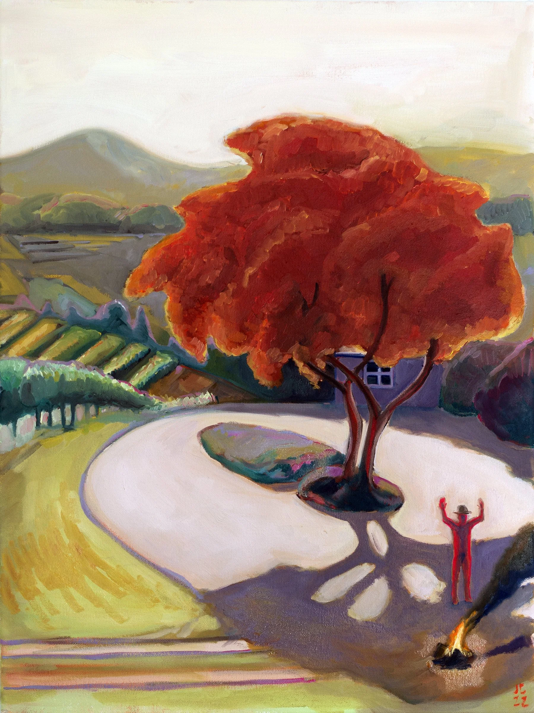 The setting is the driveway in front of the house where I stayed. That window in the background is the window to my studio. During my time there, I would spend days where I would be on my own in this vast, beautiful land. I would barely talk to anyone all day. It was bliss. And I probably went a bit feral. This painting captured some of my state of mind while I was there.