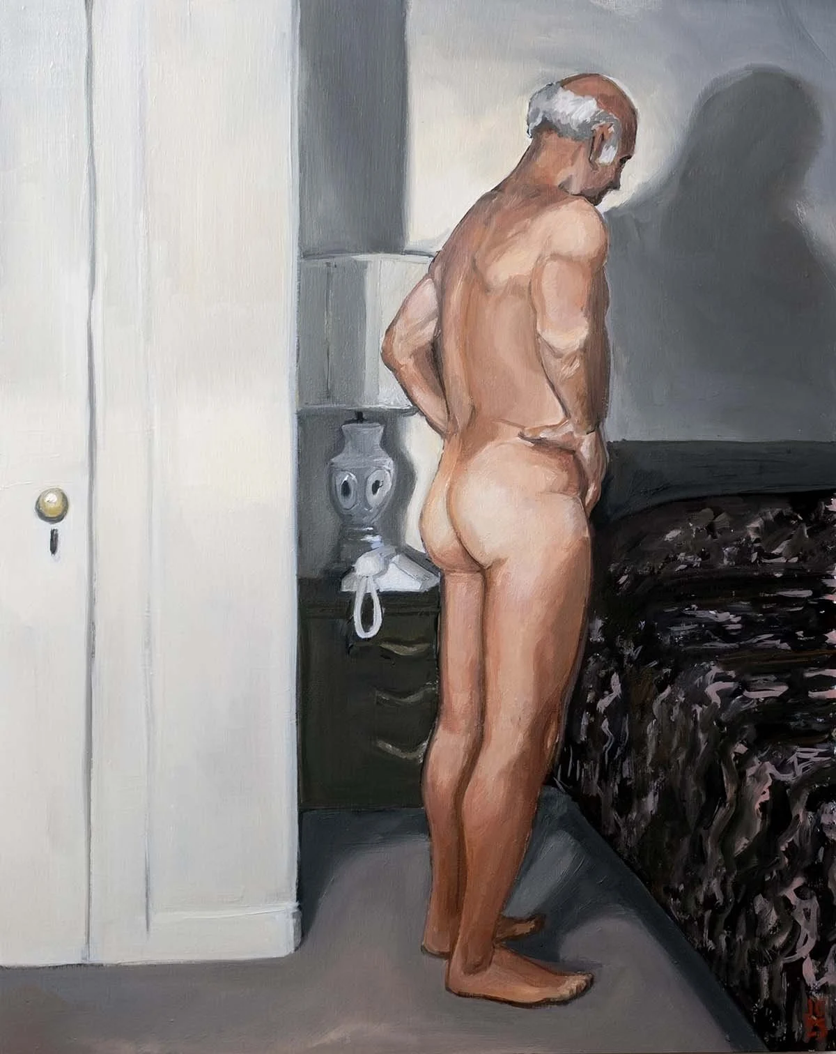 As with a lot of my paintings, I found my inspiration for Dennis from a vintage photo. I bought the snapshot off of eBay. I liked its composition. When I received the picture, it came with a second snapshot that was clearly from the same photo session. That picture was much less evocative and much more direct – a full-frontal shot with a come-hither expression. I’m guessing that the pictures were part of a pre-Grindr hook-up ad printed in the back of some less-than-reputable periodical.