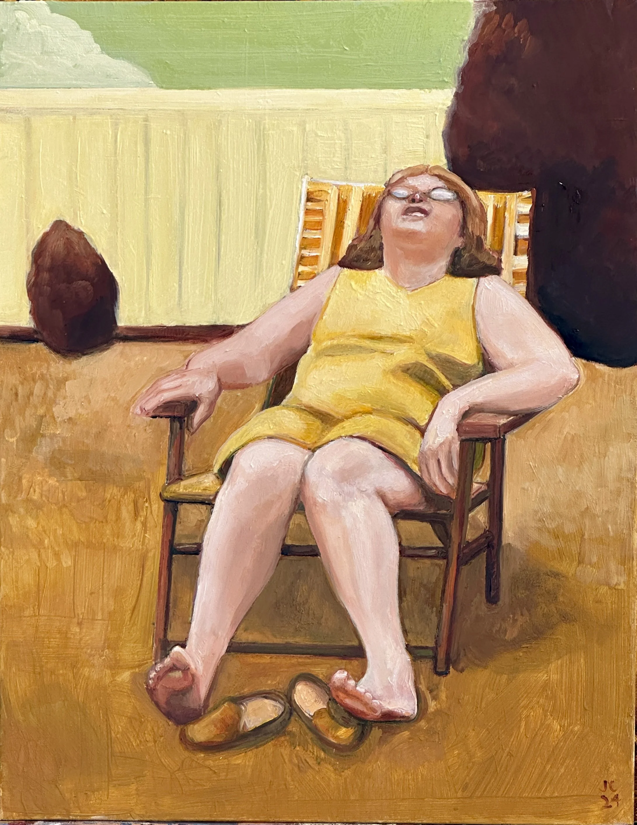 This painting shows a middle-aged woman catching a private moment of joy in her backyard, bare feet on dead grass. I did this partially to see how far I could go with painting using just shades of yellow. I cheated a bit with the flesh tones.