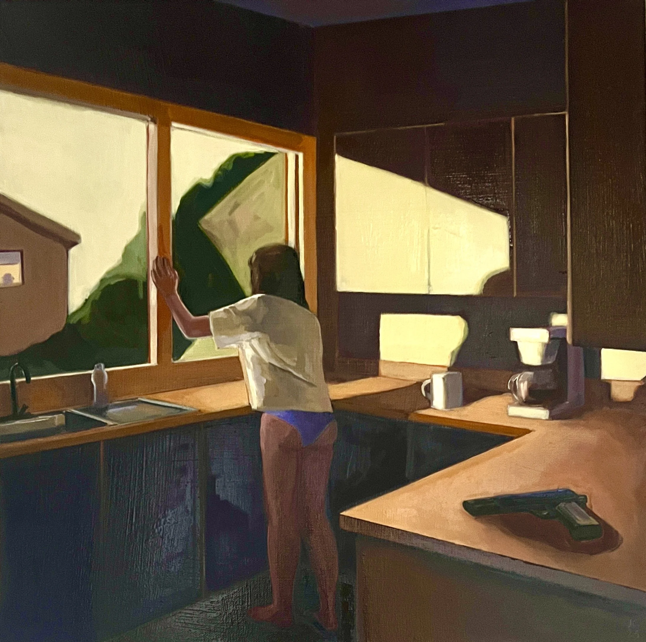 If last week’s painting – Dennis – recalls an Edward Hopper painting, this one looks a bit like a still from a Hitchcock movie imagined by David Hockney.