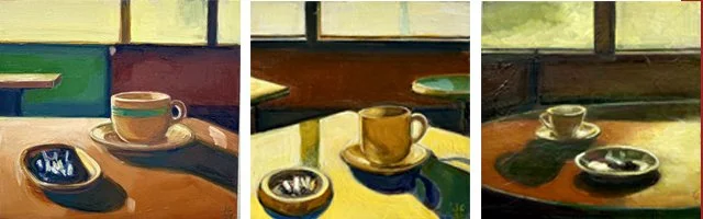 Here’s two small paintings I recently did. They are called, imaginatively, Coffee and Cigarettes No. 1 and Coffee and Cigarettes No. 2 (both 6x6” Oil on panel)
