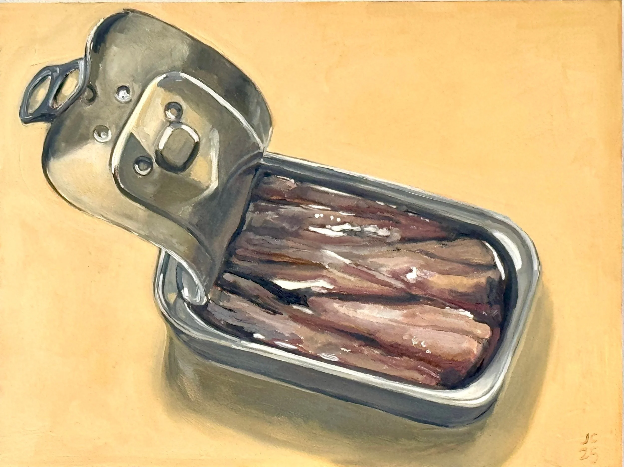 As I’m sure you can surmise, the show, which Studio Gallery hosts annually, is about artworks related to food. This year, I painted a picture of a can of sardines, which I creatively titled Sardines!. I’ve always liked canned fish. And they say, paint what you love. I made this painting using only four pigments – red, yellow ochre, black, and white — the Zorn palette.
