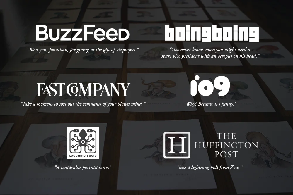 After getting laid off from a large tech company, I decided to reinvent my life in the most rational way possible: I picked up a pen and began drawing portraits of every single U.S. vice president with an octopus on his head. My insane project has been written up in BuzzFeed, Boingboing, i09, Huffington Post and other sites. For some reason, it struck a chord and a bunch of people gave me money on Kickstarter to turn my portraits into a single volume called Veeptopus: 48 Vice Presidents with Octopuses on Their Heads. Life is funny.